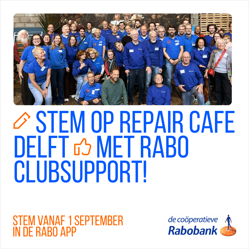 Net als voorgaande jaren doet Repair Café Delft ook dit jaar mee met Rabo ClubSupport. We hebben al verschillende keren een mooi bedrag ontvangen van de Rabobank, waarmee we ons werk kunnen voortzetten en onder andere gereedschappen kopen. De hoogte van het bedrag dat we krijgen wordt bepaald door het aantal stemmen dat op ons wordt […]